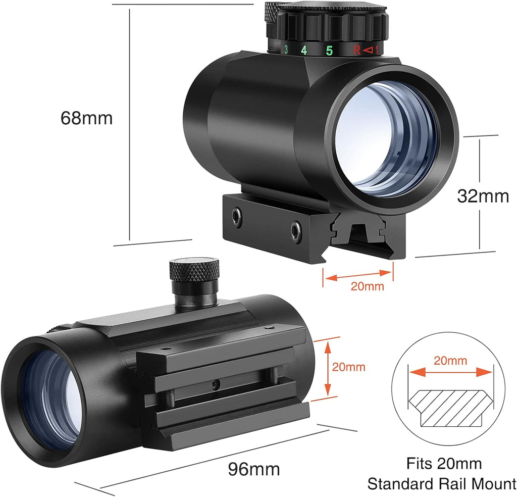 • Red or green dual illuminated dot reticles with 5 level brightness control.