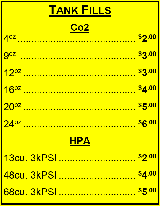 We are currently offering paintball tank fills, call ahead to check availability.